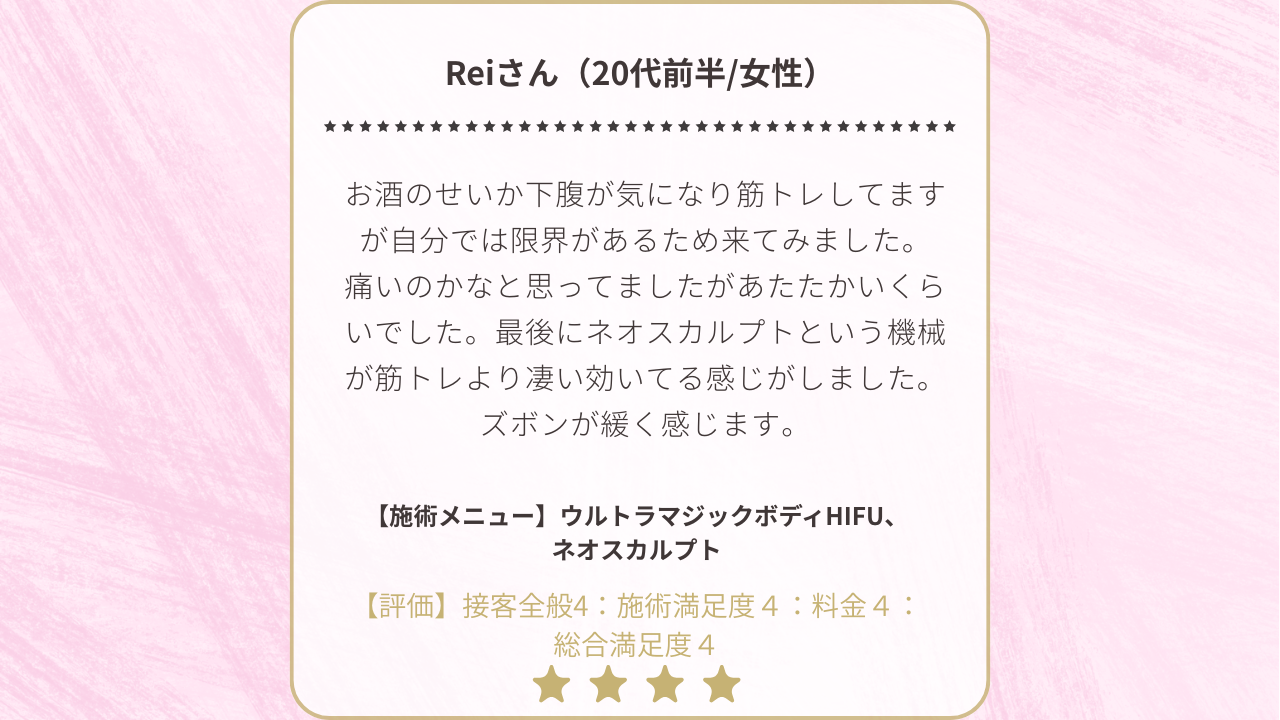 セルライトを除去しつつ、しっかり温めることができるので、血液の循環が良くなります。そのため、痩身効果だけでなく、冷え性の改善や、肩こりの解消といった効果も期待できるでしょう。また、リンパの流れも良くなり、老廃物をより排出するようになるので、むくみの除去にも有効です。※ダウンタイムなし